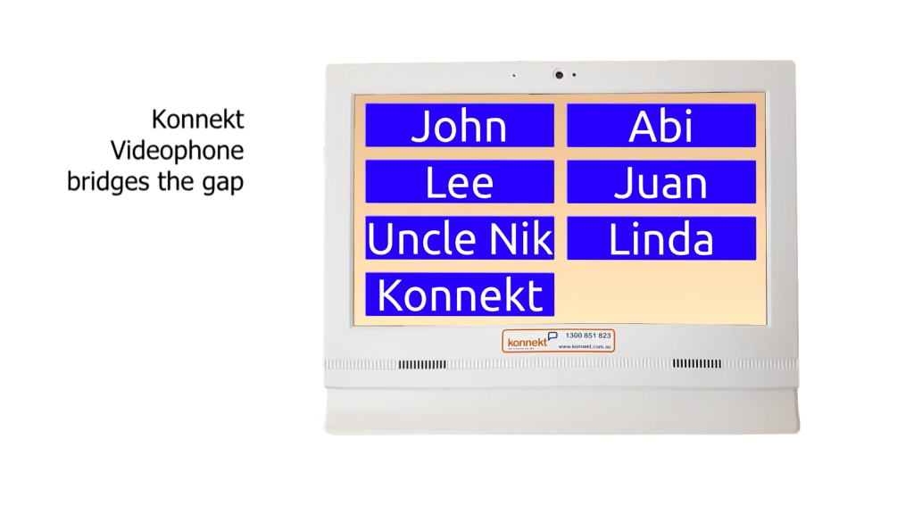 The Konnekt Videophone has been designed specifically for the seniors and people with disability, to enable face-to-face contact with family and friends through the simplest interface possible: one touch to dial.